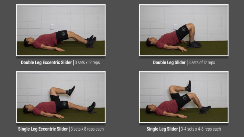 Level 1 – Double Leg Eccentric Slider. Bridge up, keep your glutes squeezed, slowly slide your legs out, drop down, bring your feet back to the starting position, and repeat. If you can work up to 3 sets of 12 reps, progress to the next level.