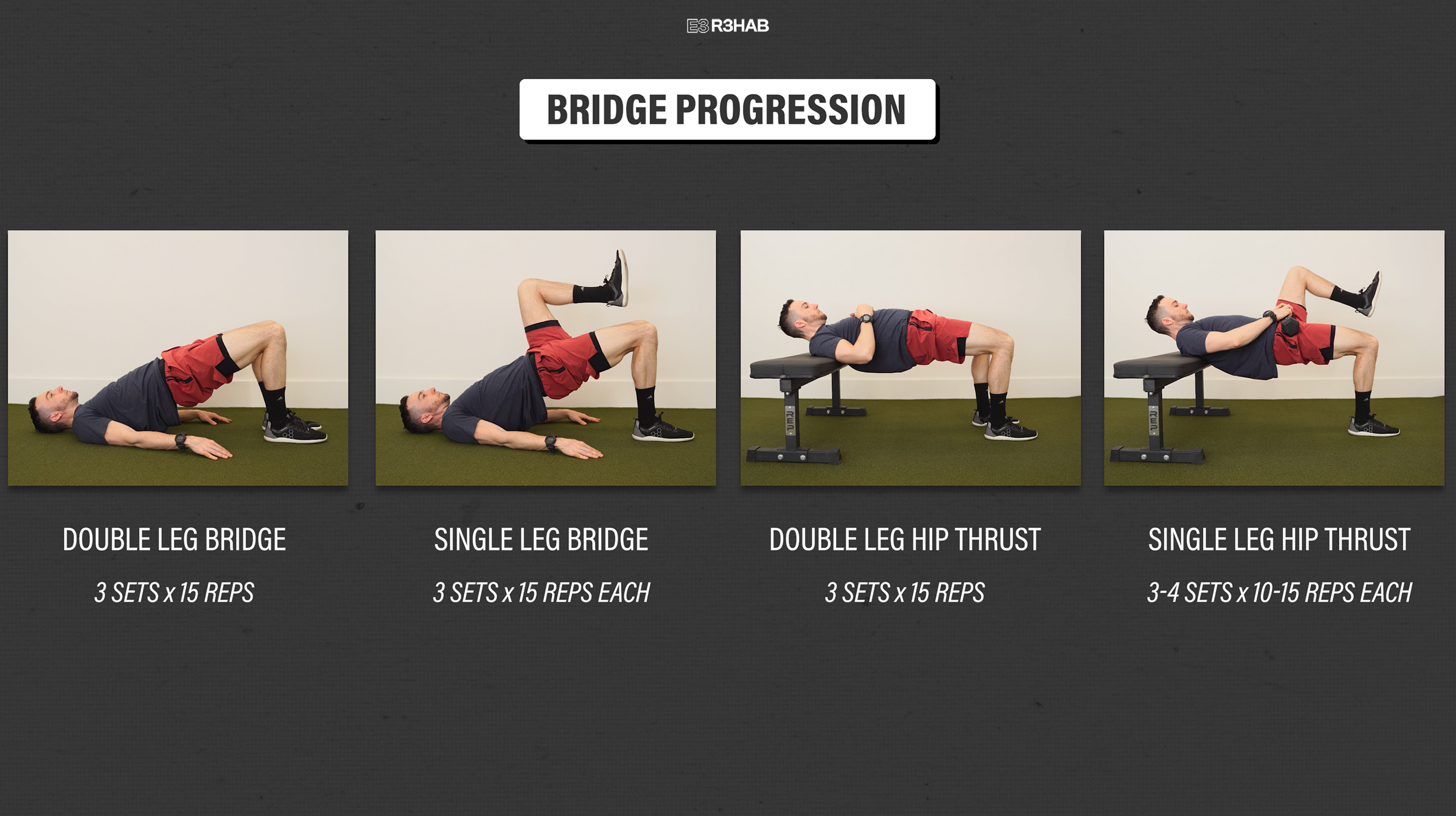 - Level 1 – Double Leg Bridge. Lift your hips up and squeeze your glutes, before lowering back down. Once you can complete 3 sets of 15 repetitions with tolerable symptoms, progress to the next level.