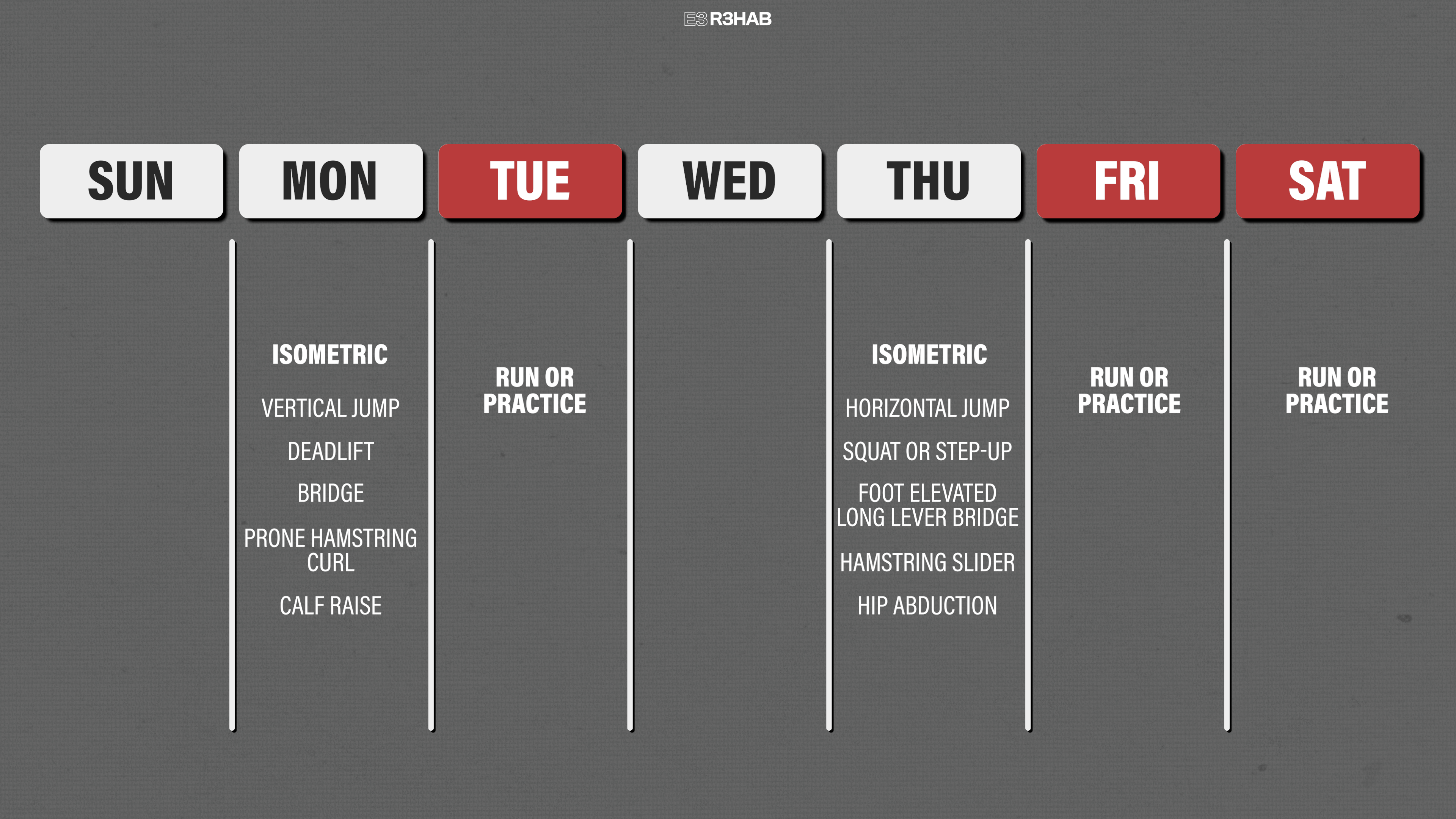 You also then introduce the progressive loading exercises twice a week in order to help build up your tolerance to hamstring loading. You start with the heavy slow resistance exercises and then once you meet the given criteria, you begin the jumping and plyometrics.