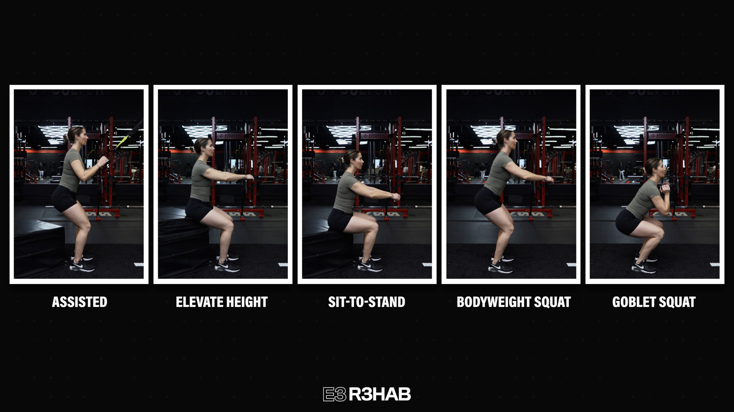 Sit-to-stands from a chair are convenient for most people. If you want to make them easier, you can elevate the height of the seat or use your hands for assistance. If you want to make them harder, you can do bodyweight squats. From there, you can progress to holding a weight in your hands.