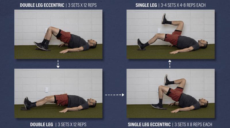 Level 1: Double leg eccentric sliders. Bridge up and slowly straighten your legs. Lower down and repeat. Build up to moving through your full range of motion for 3 sets of 12 reps.