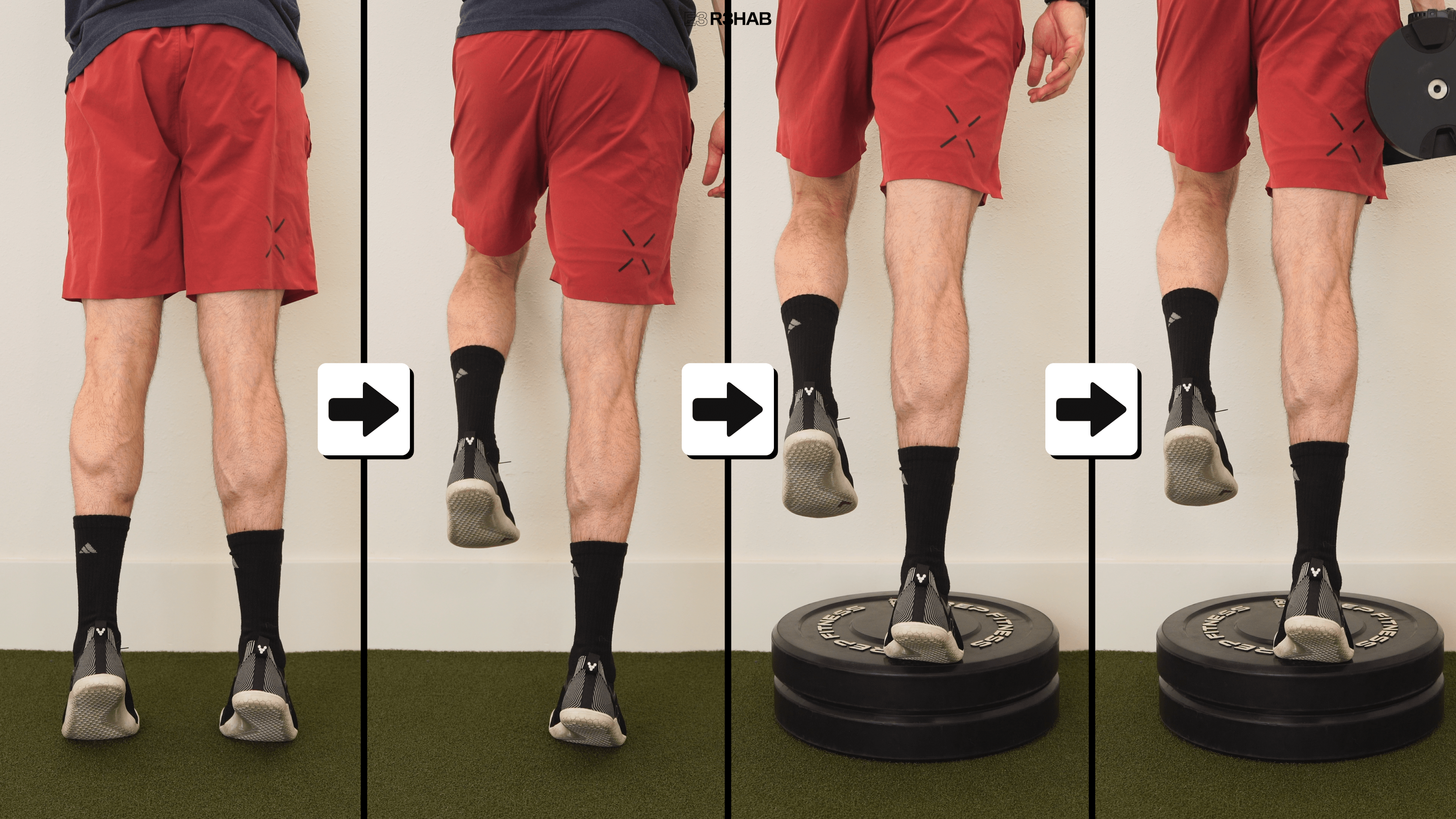 For the calves, you can work through this standing progression. Start double leg, progress to a single leg, then a single leg deficit, and finally add weight over time.