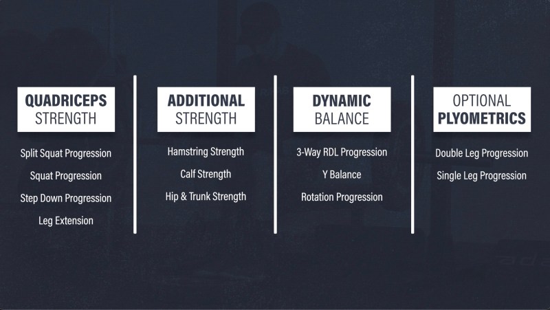 The mid-stage of rehab consists of strength, dynamic balance, and plyometric exercises in order to further increase your knee stability and better prepare you for running and return to sport.