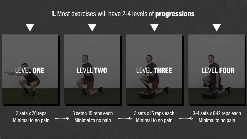 1. Most exercises in this stage will have 2 to 4 levels of progressions that you will work through. You will not progress to the next level until you have met certain criteria with minimal to no pain.