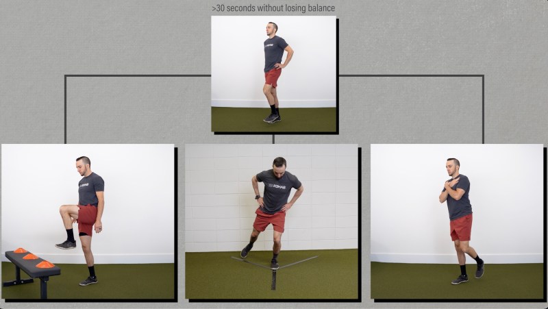 Once you can stand on one leg for at least 30 seconds without losing balance, you will progress to dynamic variations that expose your knee to rotational and lateral stress. Here are 3 options.