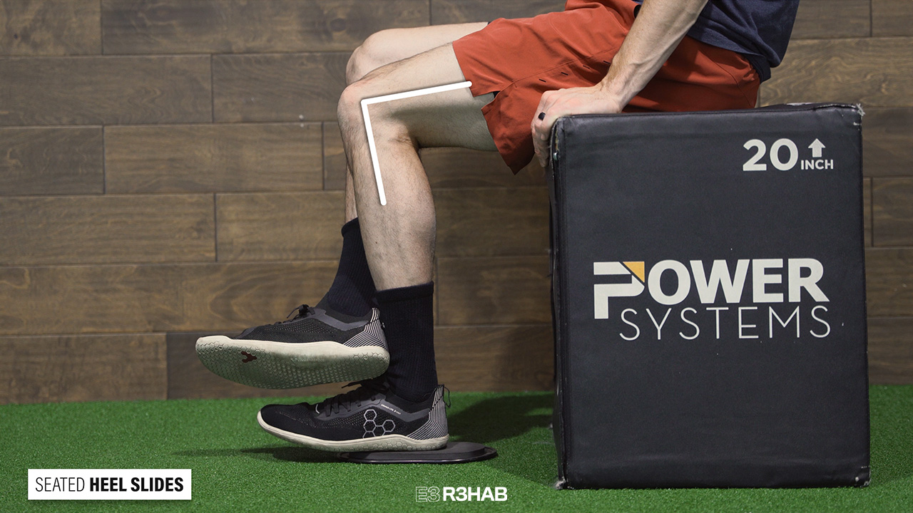 Option 2: Seated Heel Slides. Sit on the edge of a chair and place your foot on a slider if you’re on carpet or a towel if you’re on a hard surface. Using your other leg, gently slide your foot backward, trying to bend your knee as much as you can. Hold the end position for a few seconds, then return to the starting position. Repeat for 2-3 sets of 10-20 repetitions.