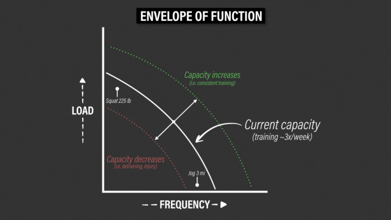 Load is on the Y axis. Frequency is on the X axis. Assuming you train a few times per week, you have a certain capacity to withstand various stressors on your knees without having an injury. Maybe you can jog 3 miles and squat 225lbs.